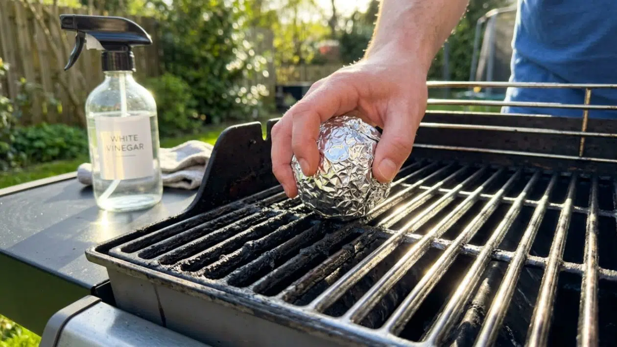 Der Profi-Hack: Nehmen Sie ein langes Stück normale Alufolie aus der Küche und knüllen Sie es fest zu einer pflaumengroßen Kugel zusammen. Reiben Sie mit dieser Kugel nun kräftig über den feuchten, essiggetränkten Grillrost. Der magische Effekt: Die weiche Alufolie passt sich sofort der Rundung jedes einzelnen Gitterstabes an! Sie reiben nicht mehr nur oben auf dem Rost, sondern umfassen den Stab zu 180 Grad. Die Rillen der Folie schaben das aufgeweichte Fett messerscharf ab, zerkratzen aber niemals die harte Emaille- oder Chromschicht darunter! -