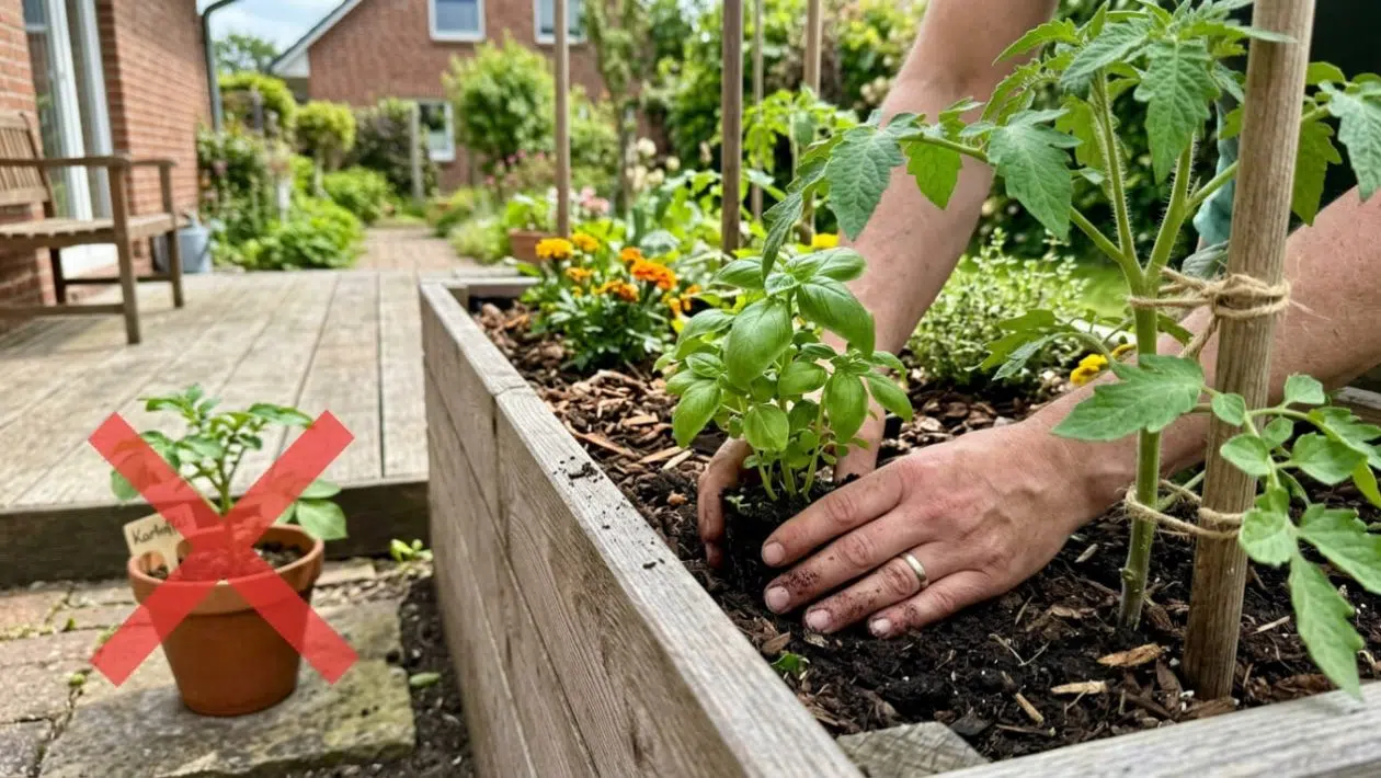 Der Profi-Hack: Setzen Sie niemals Gemüse ohne Kräuter ins Hochbeet! Kräuter haben extrem starke ätherische Öle, die Schädlinge verwirren und vertreiben. Pflanzen Sie zwingend Basilikum direkt neben Ihre Tomaten (Basilikum vertreibt die weiße Fliege und Mehltau!). Setzen Sie leuchtend orangefarbene Studentenblumen (Tagetes) zwischen Ihr Gemüse. Ihre Wurzeln sondern einen Stoff ab, der gefährliche Nematoden (Fadenwürmer) tief in der Erde abtötet. -