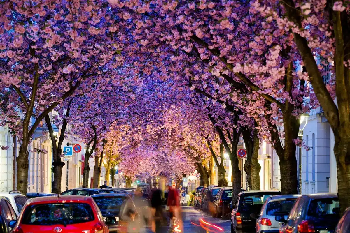 Es ist der absolute optische Höhepunkt des deutschen Frühlings. Sobald Mitte April die japanischen Zierkirschen aufbrechen, färben sich die Social-Media-Feeds schlagartig pink. Die Bilder von endlosen, leuchtend rosa Blütentunneln, vor allem aus der Heerstraße in Bonn oder aus Berlin, wecken Sehnsüchte.