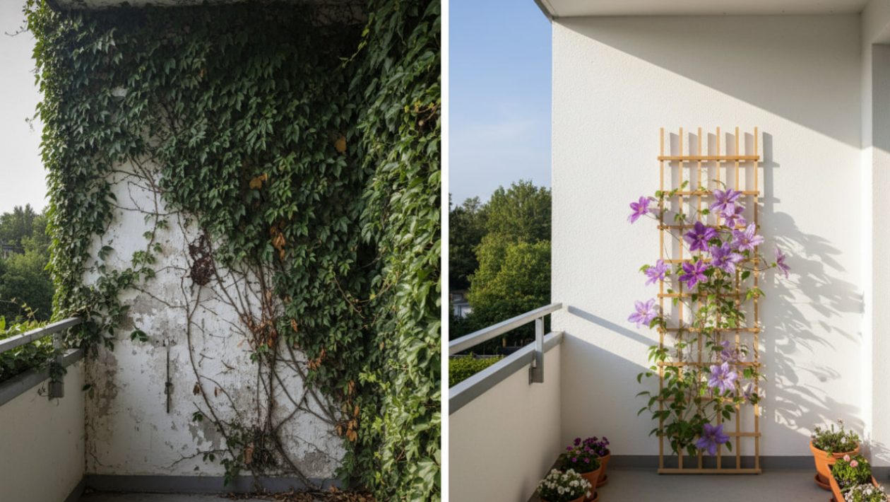Frau Lehmann bezahlte ihre teure Lektion. Auf ihrem neuen Balkon spannte sie nur noch feine Drahtseile und pflanzte eine Clematis. Der Sichtschutz war im Sommer viel bunter als zuvor, und die Wände des Hauses blieben sicher und trocken.
