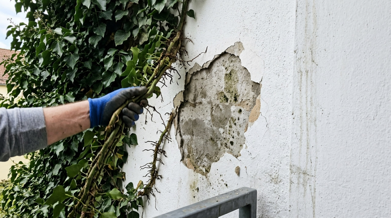 Ich musste Frau Lehmann erklären, dass Efeu und Wilder Wein zu den „Selbstklimmern“ gehören. Sie bilden extrem aggressive Haftwurzeln, die sich wie Betonkrallen in jede kleinste Pore der Farbe und des Putzes bohren. Wer so etwas anlegt, gefährdet die Wohngesundheit des gesamten Gebäudes.