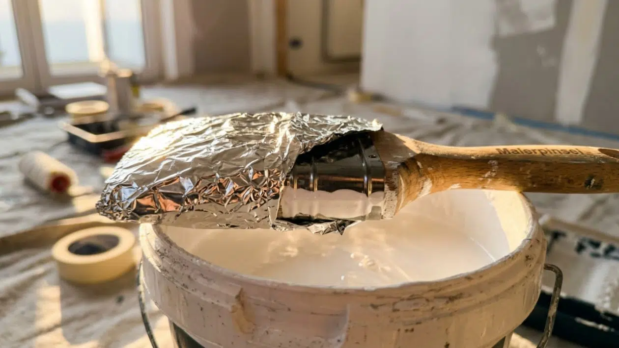 Der Profi-Hack: Greifen Sie zur klassischen Aluminiumfolie (Alufolie) aus der Küche! Alufolie ist absolut luft- und dampfundurchlässig. Wenn Sie eine Pause machen, waschen Sie die Farbe NICHT aus! Lassen Sie den Pinsel oder die Farbrolle ruhig richtig dick mit Farbe getränkt. Wickeln Sie das Werkzeug extrem stramm und mehrfach in ein großes Stück Alufolie ein. Drücken Sie die Folie fest an die Form der Rolle oder des Pinsels, sodass absolut kein Hohlraum mehr für Luft bleibt (falzen Sie die Enden am Stiel eng zusammen). In dieser „Silber-Mumie“ ist der Sauerstoff zu 100 % abgeschnitten. Die Farbe kann nicht mehr verdunsten! -