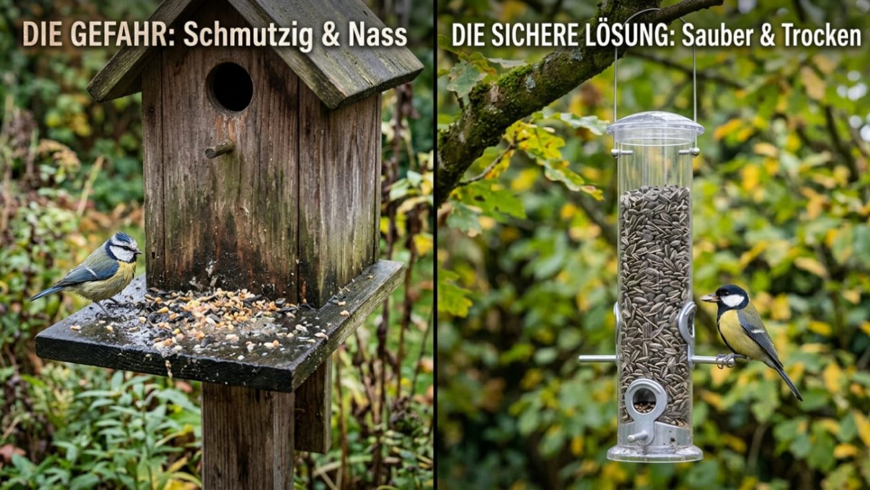| 1. Das offene Holzhaus | Vögel koten ins eigene Futter. Feuchtigkeit führt zu extrem giftiger Schimmelbildung und tödlichen Trichomonaden-Infektionen. | Die Futtersäule (Silo)! Hängen Sie Kunststoff- oder Metallsäulen auf. Das Futter rutscht sicher im Inneren nach, bleibt immer trocken und die Vögel können nicht darauf herumlaufen. |