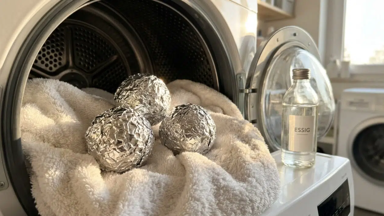Anna spülte das Weichspülerfach ihrer Waschmaschine gründlich aus und füllte beim nächsten Waschgang einen ordentlichen Schuss weißen Tafelessig ein. Für die anschließende Trocknung formte sie drei feste Kugeln aus Alufolie und legte sie zu den feuchten Textilien. Als der Trockner fertig war, zog sie ein knisterfreies, herrlich weiches Hemd heraus. Beim Duschen trocknete das frisch gewaschene Handtuch ihre Haut perfekt und blitzschnell ab. Die Bälle aus Alufolie ließ sie einfach im Trockner liegen – bereit für die nächsten dreißig Waschgänge.