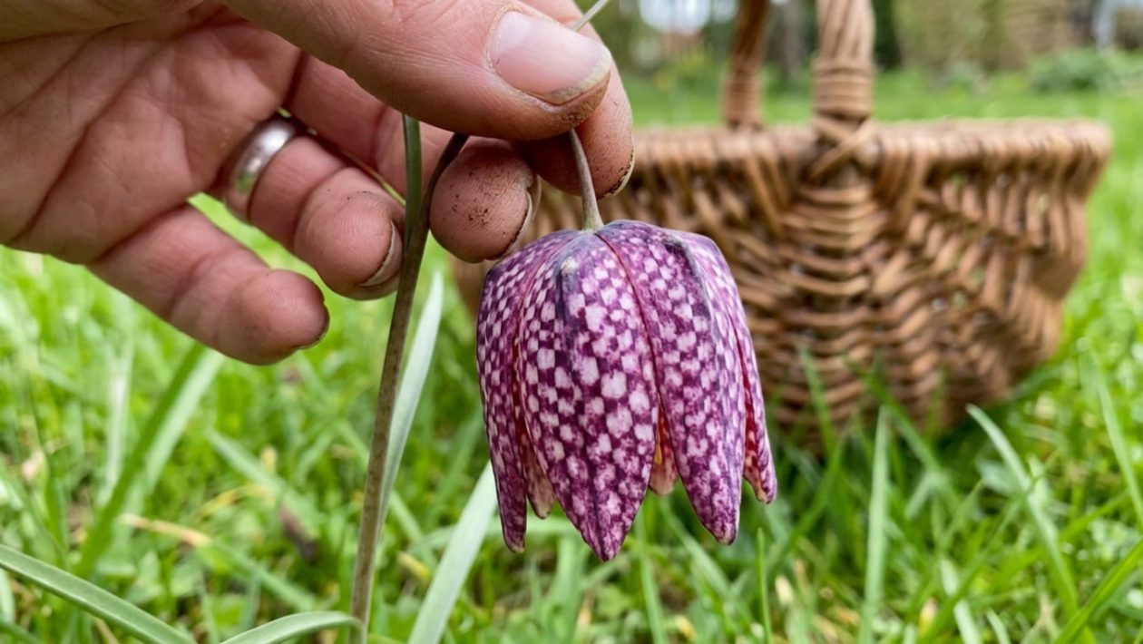 Die Pflanze, die aus dieser stinkenden Zwiebel wächst, gehört zur Familie der Fritillarien (Kaiserkronen-Gewächse). Während die klassische Kaiserkrone sehr groß und auffällig ist, pflanzten wir für Frau Kellers romantischen Bauerngarten (der aktuell so beliebte „Cottagecore“-Stil) die kleine, filigrane Schwester: Die Schachbrettblume (Fritillaria meleagris).
